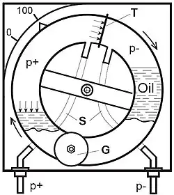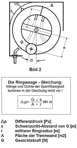 Ein knapp zur Hälfte mit einer Sperrflüssigkeit gefüllter, drehbar gelagerter Hohlring ist durch eine Trennwand oben geteilt. Die oberhalb der sperrenden Flüssigkeit bestehenden Kammern sind über flexible Schläuche an die zu messenden (Differenz-)Drücke angeschlossen. Eine Druckdifferenz zwischen den beiden Kammern dreht den Ringkörper so weit, bis sich ein Kräftegleichgewicht mit dem unten befestigten Gegengewicht einstellt.