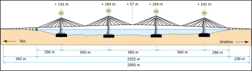 Die insgesamt 2883 m lange Brücke besteht aus der 2252 m langen Hauptbrücke über dem Meer, der 392 m langen Rampenbrücke für die Zufahrt bei Río sowie der 239 m langen Rampenbrücke bei Andírrio. Die Hauptbrücke hat Stützweiten von 286 m, dreimal 560 m und 286 m. Die beiden mittleren Pylone sind insgesamt 230 m hoch, sie stehen in 65 m tiefem Wasser und erheben sich weitere 164 m über den Meeresspiegel. Die beiden äußeren Pylone stehen in etwas weniger tiefem Wasser und erreichen eine Höhe von 141 m über dem Meeresspiegel. Das Brückendeck erhält dadurch eine die ganze Meerenge überspannende Wölbung nach oben. Die mittlere Durchfahrt hat eine lichte Höhe von 52 m.[3] Auf der Basis der Länge der Hauptbrücke ist sie die zweitlängste Schrägseilbrücke der Welt (nach dem 2460 m langen Viaduc de Millau).