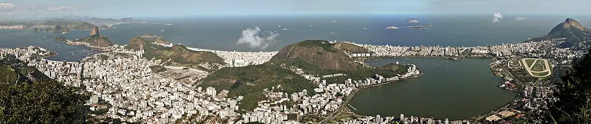 Rio de Janeiro liegt unmittelbar nördlich des südlichen Wendekreises, eingebettet zwischen dem Atlantik im Süden, der Guanabara-Bucht im Osten und den Ausläufern der Serra do Mar, eines Teils des zentralbrasilianischen Hochlandes, im Norden und Westen. Das administrative Stadtgebiet hat eine Fläche von 1182 Quadratkilometern und liegt durchschnittlich 31 Meter über dem Meeresspiegel.[4] Es ist geprägt durch die Buchten und Strände entlang der Ufer, sowie durch Morros genannte Granithügel, die zu den Ausläufern der Serra do Mar gehören.
