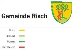 Die Gemeinde Risch gliedert sich in die Kleinstadt Rotkreuz, in welcher über 80 % der Gesamtbevölkerung leben, sowie die Dörfer Buonas, Holzhäusern und Risch. Rotkreuz entstand seit Mitte des 20. Jahrhunderts aus dem Zusammenwachsen der Weiler Waldeten und Rotrüti, später Küntwil und mehrerer Einzelhöfe zur Streusiedlung.[23] Das bis ins 20. Jahrhundert rein landwirtschaftlich genutzte Gebiet wurde geprägt durch verstreut liegende Bauernhöfe, in welchen die Kirchweiler Risch und Holzhäusern sowie Buonas grössere Weiler bildeten.[20] Bis heute konnten diese drei Orte, trotz des enormen Wachstums und der Hauptortfunktion von Rotkreuz, ihre Eigenständigkeit beibehalten und wuchsen zu Haufendörfern. Neben diesen Ortschaften gibt es drei durch das ARE anerkannte Weiler in der Gemeinde Risch,[24] einige weilerähnliche Streusiedlungen mit Bauernhöfen und Einzelsiedlungen.