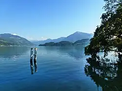 Südlich grenzt die Gemeinde nicht wie oft angenommen an den Bezirk Küssnacht im Kanton Schwyz, sondern nur an den Wahlkreis Luzern-Land (vormals Amt Luzern) im Kanton Luzern, im Westen an den Bezirk Muri im Kanton Aargau. Die angrenzenden Gemeinden sind, im Uhrzeigersinn, die Luzerner Gemeinden Meierskappel, Gisikon und Root, die aargauischen Gemeinden Dietwil und Oberrüti sowie die Zuger Gemeinde Hünenberg.[20] Durch die Seeverbindung grenzt Risch an die Zuger Gemeinden Cham und Zug. Ein Dreikantoneeck findet sich in der Reuss bei Rotkreuz