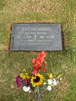 Im Alter von 43 Jahren machten sich bei Rita Hayworth die ersten Anzeichen der Alzheimer-Krankheit bemerkbar.[55] Zu Beginn der 1970er Jahre hatte sich ihr Gesundheitszustand derart verschlechtert, dass sie keine weiteren Rollen mehr annehmen konnte. Im Juli 1981 wurde sie entmündigt.[56] Ihre Tochter aus der Ehe mit Prinz Aly Khan, Yasmin Aga Khan, nahm sie zu sich nach New York und pflegte sie bis zu ihrem Tod im Jahr 1987. Hayworth starb 68-jährig und wurde auf dem Holy Cross Cemetery in Culver City, Kalifornien, beigesetzt.