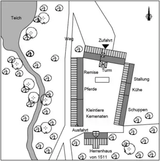Historische Gutshofanlage bis zum verheerenden Brand im Jahr 1885 Der Wirtschaftshof war trapezförmig angelegt und bildete mit dem Gutshaus einen Vierseithof. Die Wegeverbindung ging bis ins 17. Jahrhundert über den Hof durch ein nördliches Einfahrtstor mit Türmchen und einem südlichen Ausfahrtstor. Nur ein schmaler Weg verlief außerhalb des Gutes direkt an der Westseite. |