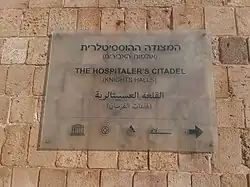 Tafel mit Bezeichnungen für die Kommende (und Ritterhallen) in Hebräisch = Johannitische Festung, Englisch = Johanniterzitadelle und Arabisch = Johannitische Burg[67]