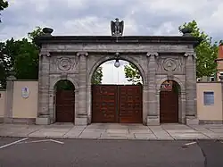 Von der Heidehofstraße ist die Villa über ein mächtiges Portal erreichbar. Dieses wurde 1934 umgestaltet und beispielsweise mit dem Relief des „Bosch-Zünders“ versehen.[5]