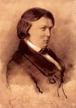Robert Alexander[1] Schumann (* 8. Juni 1810 in Zwickau, Königreich Sachsen; † 29. Juli 1856 in Endenich, Rheinprovinz, heute Ortsteil von Bonn) war ein deutscher Komponist, Musikkritiker und Dirigent. Er wird heute zu den bedeutendsten Komponisten der Romantik gezählt. In der ersten Phase seines Schaffens komponierte er vor allem Klaviermusik. 1840, im Jahr seiner Eheschließung mit der Pianistin Clara Wieck, schrieb er knapp 150 Lieder.[2][3] In den folgenden Jahren entwickelte sich sein Werk zu großer Vielfalt: Er komponierte von da an auch Orchestermusik (darunter vier Sinfonien), konzertante Werke, Kammermusik, Chormusik und eine Oper.