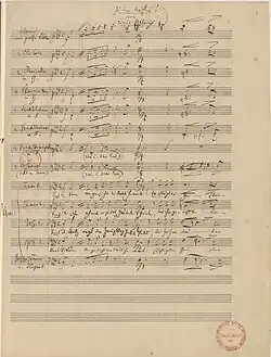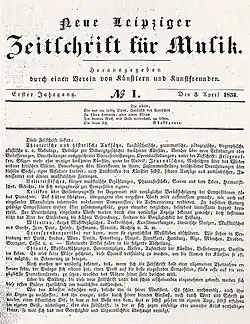 Zusammen mit Friedrich Wieck, dem gleichaltrigen Ludwig Schuncke († 7. Dezember 1834 in Leipzig) und einigen weiteren Freunden gründete Schumann im April 1834 die 1835 in Neue Zeitschrift für Musik umbenannte Neue Leipziger Zeitschrift für Musik und machte damit der Allgemeinen musikalischen Zeitung Konkurrenz, in der er selbst 1831 einen bedeutenden Beitrag über Chopins op. 2, die Variations sur "Là ci darem la mano" de "Don Juan" de Mozart, veröffentlicht hatte.[67] Da die Mitbegründer für das Projekt kaum Zeit aufbringen konnten, übernahm er zehn Jahre lang den größten Teil der Arbeit als Herausgeber und Redakteur und schrieb auch selbst viele Beiträge. Im Juli 1844 gab Schumann die Leitung der Zeitschrift an seinen Autor Oswald Lorenz ab.[68] Die allgemeine Zielrichtung der Zeitschrift formulierte Schumann im ersten Heft des Jahrgangs 1835: „[D]ie alte Zeit und ihre Werke anzuerkennen, darauf aufmerksam zu machen, wie nur an so reinem Quelle neue Kunstschönheiten gekräftigt werden können – sodann die letzte Vergangenheit als eine unkünstlerische zu bekämpfen, für die nur das Hochgesteigerte des Mechanischen einigen Ersatz gewährt habe – endlich eine junge, dichterische Zukunft vorzubereiten, beschleunigen zu helfen“.[69][68] In seinen 1854 erschienenen Gesammelten Schriften über Musik und Musiker ersetzte er den Begriff der jungen, dichterischen Zukunft durch den der neuen, poetischen Zeit. Mit dieser Maxime erfasste Schumann auch seinen eigenen künstlerischen Werdegang vom dichtenden und komponierenden Kind und Jugendlichen zum erwachsenen Komponisten, der, ausgehend von der musikalischen Poetik Jean Pauls, „gekräftigt“ an den Werken Beethovens und vor allem Johann Sebastian Bachs, seine eigene poetische Musik schuf. Schumann drückte folgerichtig vielen seiner Besprechungen von Werken und Aufführungen seinen Stempel auf: den der poetisierenden Kritik, vergleichbar mit E. T. A. Hoffmann, der Jahrzehnte zuvor unter dem Pseudonym Johannes Kreisler für die Allgemeine musikalische Zeitung in einem ähnlichen Stil geschrieben hatte. In Schumanns Texten ist alles vertreten, ernsthafte Auseinandersetzung, subtiler Spott, aber auch wie bei Giacomo Meyerbeers Hugenotten höhnischer Verriss.[70]