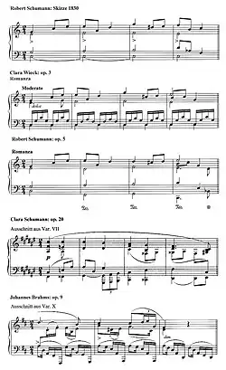 - ↑ Briefe Robert Schumanns an Brahms, in denen er dessen Variationen erwähnt, die Herkunft des Zitates aber nicht erkennt. Zitiert auf der Website des Schumann-Portals.