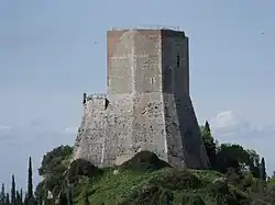 - Rocca di Tentennano (auch Tintinnano oder Tintennano genannt[10]), heute im Staatsbesitz befindliche achteckige Burg,[1] ehemaliger Besitz der Familie Salimbeni in Sichtweite des (ehemaligen) Hauptsitzes in Radicofani.