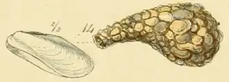 Rocellaria dubia, Gehäuse und sekundäre Röhre (aus G. B. Sowerby II, 1859: Taf. 1, Fig. 14[1]) | ||||||||||||