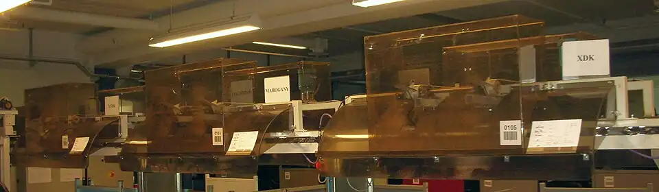 - Die bereits vorgegerbten Tibetlammfelle aus China kamen in rechteckigen Kisten aus besonders hartem Holz, innen mit orangefarbigem Ölpapier ausgeschlagen.[16] In noch früherer Zeit galt das auch für die Vogelbälge zum Garnieren von Hüten, von Grebes und anderen, die aus Russland und Kleinasien kamen.[16] Über die Felle des Afrikanischen Strauß, dem größten noch lebenden Vogel, vermerkte ein Handbuch für den Häutehandel im Jahr 1956: