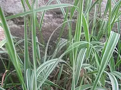 - Bandgras oder Spanisches Gras (Phalaris arundinacea var. picta L.): Seine Blattspreiten sind anfangs rosafarben oder weiß gebändert und später gelblichweiß oder rein weiß gestreift.[1] Das Bandgras wird schon seit etwa 1600 in Gärten kultiviert.