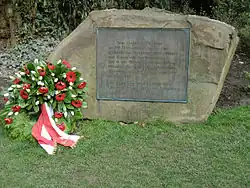 Torhaus, im Vordergrund Gedenkstein für NS-Opfer