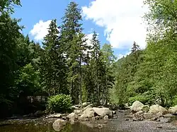 Bei Romkerhalle stürzt an der felsigen Ostflanke des Okertals unterhalb des Huthberg-Ausläufers Kleiner Romke (441,7 m ü. NHN)[12] der (nach Daten der Niedersächsischen Landesvermessung) 50 Meter hohe[13] künstlich angelegte Romkerhaller Wasserfall hinab. Traditionell wird ihm allerdings eine Höhe von 64 Metern attestiert.[14] Dieser dennoch mit Abstand höchste Wasserfall im Harz stürzt an der Romke-Klippe (zeitgenössisch auch Rohmkerklippe oder Marmorklippe genannt) von 384,6 m ü. NHN auf das Niveau der Bundesstraße 498 hinab (334,7 m ü. NHN). Das Wasser wird vom Oker-Zufluss Kleine Romke abgezweigt und über einen etwa 350 m[12] langen Hangkanal der Fallkante zugeleitet.