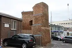 Der halbrunde Bastionsturm aus Backsteinmauerwerk steht in der Schützenstraße zwischen zwei Geschäften hinter einem Parkplatz.