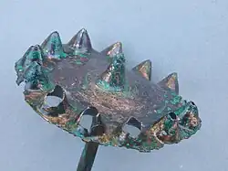 Die beiden bisher bekannten Exemplare sind sich sehr ähnlich. Die vollständige Nadel ist 126 mm lang. Als Nadelkopf dient eine horizontale Scheibe mit einem Durchmesser von 52 mm, die mit Buckeln und Ritzlinien verziert ist. Zwischen zwei Buckeln befindet sich ein Loch zum Fixieren. Der quadratische Nadelschaft mit einem Querschnitt von 3,8 mm weist eine Tordierung auf. Die Nadeln sind im Urzeitmuseum Nußdorf ob der Traisen und im Schul- und Heimatmuseum Neumarkt an der Ybbs ausgestellt.