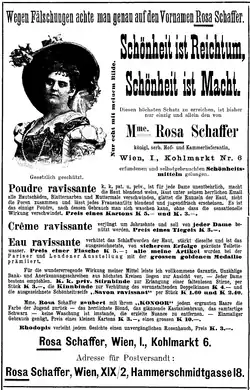 - ↑ a b Werbung: Schönheit ist Reichtum, Schönheit ist Macht. In: Österreichs Illustrierte Zeitung – Kaiser-Festnummer, Jahrgang 1908, Beilage 1, 2. Dezember 1908, S. 7, unten rechts. (online bei ANNO).
