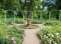Östlich der Großen Fontäne gelangt man zum von grüngestrichenen Holzbögen eingefassten Schmuckplatz mit den acht Rosenbeeten. Er hat in seiner Mitte ein steinernes Brunnenbecken mit einem kleinen Springbrunnen in der auf einer Brunnensäule ruhenden Brunnenschale, das zwischen 1821 und 1823 entstand. Sein Vorbild befindet sich im Rosengarten des Humphry Repton in Ashridge Park, dem der Herzöge von Leeds, in der Grafschaft Hertfordshire bei London.[2] Im Buch: Fragments on the Theory and Practice of Landsscape Gardening, London 1816, ist dieses Rondell abgebildet. In der Herzogin-Anna-Amalia-Bibliothek befindlich bot es den Gartengestaltern in Weimar somit auch die Vorlage. Eine Grundrißzeichnung des Rosenberceaus ist in dieser ebenfalls vorhanden. Es trägt die Inventar-Nr.: Kt 100 Weimar 127 E Ms.[3] Nach dem Tode von Großherzog Carl Friedrich wurde eine Büste Humphry Reptons in einer Nische aufgestellt, die inzwischen verschollen ist.[4] Die gefasste Brunnenschale ist am Rande so gestaltet, dass sich ein tröpfelnder Wasservorhang bildet. Der heutige Brunnen ist eine 2006 gefertigte Kopie in Sandstein.[5] Ursprünglich wurde dieses in Tonndorfer Sandstein gefertigt, dann 1978 vom Steinmetz Seifert aus Teichel aus Cottaer Sandstein ersetzt.[6]