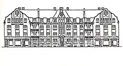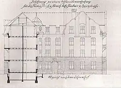 Das Gebäude ist ein Dreiflügelbau, der U-förmig zur Straße geöffnet ist und einen Ehrenhof umfasst. Es hat vier Vollstockwerke sowie ein Keller- und ein Dachgeschoss. Der Keller diente sowohl als Kohlenkeller als auch als Abstellkeller für die Mieter. Zu jeder Wohnung gehörte sowohl ein Keller- als auch ein Bodenraum. Je sechs Mietparteien standen eine Waschküche und ein Trockenboden zur Verfügung.
