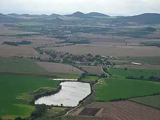 Blick von der Hasenburg auf den namenlosen Teich zwischen Lkáň und Klapý | ||