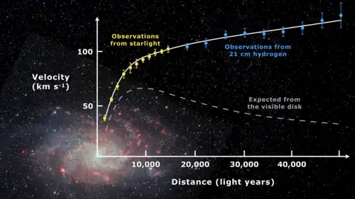 Tatsächliche Rotationskurve der Spiralgalaxie Messier 33 (gelbe und blaue Punkte mit Fehlerbalken) und eine aufgrund der Verteilung sichtbarer Materie vorhergesagte (gestrichelte, graue Linie). Die Abweichung zwischen den zwei Kurven kann mit einem, die Galaxie umgebenden, Halo aus dunkler Materie erklärt werden.[1][2][3][4]
