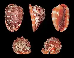 - ↑ C. Brüggemann (1838): Die Naturgeschichte in getreuen Abbildungen und mit ausführlicher Beschreibung derselben. Verlag von Eduard Eisenach, Leipzig 1838. Die Weichthiere, S. 70. Die rothe Sturmhaube. (Buccinum (Cassis) rufum L.)