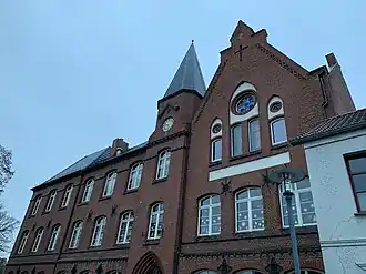 Das dreigeschossige Gebäude entstand im Wesentlichen aus rötlichen Backsteinen. Leicht ausmittig nach Osten hin ist ein turmartiger Vorbau mit einem großen, spitzbogenförmigen Portal. Nach Westen schließt sich ein sechsachsiger Flügel mit Klassenräumen an. Nach Osten ist ein dreiachsiger Flügel mit weiteren Klassenräumen und Gemeinschaftsräumen. Das Untergeschoss ist dabei mit einem Fries optisch vom übrigen Baukörper getrennt. Zwischen dem zweiten und dritten Geschoss ist im östlichen Flügel eine querrechteckige Blende mit drei darüber angeordneten, spitzbogenförmigen Blenden. Dort sind gedrückt-segmentbogenförmige Fenster mit einem darüberliegenden Ochsenauge eingelassen. Im Giebel ist ein gemauertes Kreuz. In dem turmartigen Mittelbau ist mittig eine Turmuhr.