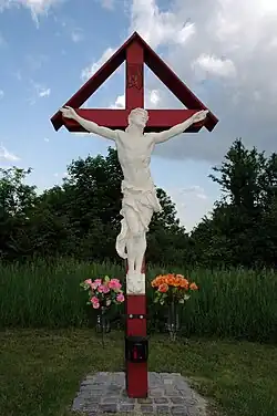 Das Rote Kreuz ist ein einfaches rot gestrichenes Holzkreuz mit zwei schmalen Brettern als Bedachung oberhalb des Querbalkens und einer blechernen Laterne für Kerzen unten. Die weiße Christusfigur aus Gusseisen stammt von der letzten Renovierung im Jahr 2012.[1] Früher befand sich eine bemalte, flache Blechfigur am Kreuz.