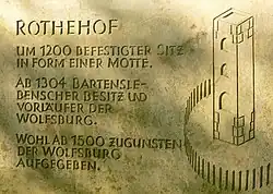 1304 wird die Burganlage erstmals urkundlich erwähnt, als Kunigunde von Bartensleben Rothehof samt Zubehör erhält. Burg Rothehof war zu der Zeit der befestigte Wohnsitz eines Ritters und seiner Familie, die im 13. und 14. Jahrhundert aus dem Stand der Ministerialen in den niederen Adel aufstiegen. Die strategische Aufgabe der Burg dürfte Schutz und Kontrolle des nahen Handelsweges durch das Tal der Aller gewesen sein. 1362 werden die von Bartensleben als Besitzer des Rothen Hoffs erwähnt. Dabei handelte es sich wahrscheinlich um die Rothehofer Linie des weit verzweigten Geschlechts, deren Angehörige zu dieser Zeit auch schon auf der Wolfsburg saßen.