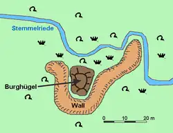 Die Reste der früheren Turmhügelburg befinden sich an einem Ausläufer des Rothe-Berges und unweit des historischen Wohnplatzes Rothehof im Wolfsburger Stadtteil Rabenberg. Sie liegen unmittelbar am Bachlauf der Stemmelriede mitten im Wald. Eine naheliegende Straße ist wegen der mittelalterlichen Anlage als Burgwall benannt worden.