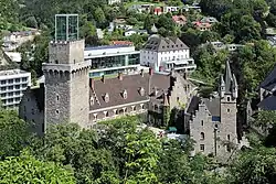 Der auffälligste Teil des Gebäudes ist der 9-stöckige, 33 m hohe[2], aus der zweiten Hälfte des 14. Jahrhunderts stammende Bergfried mit auffallendem Umgang im Bereich der Wehrplattform. Aufgesetzt auf das zinnenbekrönte oberste Stockwerk ist ein 2006 errichteter, 9 Meter hoher, verjüngter, quaderförmiger Glasaufbau, der effektvoll beleuchtet werden kann.