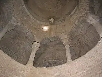 Der Innenraum der Rotunda ist umstellt von acht mächtigen monolithischen Säulen mit leichten, aber deutlich sichtbaren Längenunterschieden, die durch verschiedenartige Unterfütterungen ausgeglichen werden. Auch die Kapitelle sind unterschiedlich hoch und von unterschiedlicher Qualität. Über zwei schmale, in die dicke Außenwand integrierte Treppenaufgänge erreicht man die ‚Frauenempore‘ (matronäum), deren acht Säulen zumeist deutlich schlanker sind als diejenigen im Erdgeschoss, obwohl auch hier Unterschiede erkennbar sind. Durch das leicht nach innen vorkragende Mauerwerk entsteht ein Rund, über dem sich eine ungegliederte Kuppel wölbt, die sowohl von zwei kreuzförmigen wie von zwei runden Fenstern und zusätzlich im Scheitel von einem Laternenaufsatz belichtet wird.
