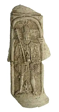 Auffällig ist eine nach links gewandte, bezopfte Büste auf einer weiteren Matrize. Das Gewand bauscht sich; ein Bäffchen weist ihn ebenso wie das Brustkreuz als Bischof in Amtstracht aus. Der Orden auf seiner Brust könnte eine Auszeichnung der Malteser sein. Dargestellt ist der Fürstbischof Leopold Ernst Graf von Firmian von Passau, der 1763 – 1783 dieses Amt ausübte. Dieser „letzte Barockfürst“ war ein bedeutender Kirchenmann und trieb u. a. die Kolonisierung des Bayerischen Waldes voran. Wegen seiner zahlreichen Reformen im Bistum wurde er zum Kardinal erhoben. Mit ihm endet das Großbistum Passau: Nach seinem Tod wurden die Diözesen Linz und St. Pölten abgetrennt.