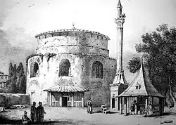 Der im Jahr 306 nach Christus als Kultbau der Kabiren oder des Zeus[2] oder als Mausoleum für den Tetrarchen Galerius errichtete Rundbau (Rotunde), dessen Innenwände ursprünglich mit einer Scheinarchitektur aus Marmor verblendet waren[3], besitzt eine 29,80 Meter hohe, von einem Okulus unterbrochene flache Kuppel aus Ziegelmauerwerk, mit einem Innendurchmesser von 24,50 Metern, bei der es sich zur Zeit der Erbauung um die weltgrößte Ziegelkuppel handelte. Die Stärke der von sechs Fenstern durchbrochenen Wände beträgt 6,30 Meter.