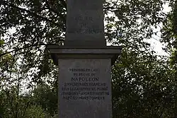 Rudolph Eickemeyer weist in seiner Schrift „Über den Sittlichen und Kunstwerth öffentlicher Denkmäler“, erschienen in der Baumgärtnerische Buchhandlung, Leipzig 1820, auf Seite 99 darauf hin, dass die auf Napoleon hinweisende Beschriftung ausgemeißelt wurde. Demnach wurde sie später wieder ergänzt.[2]