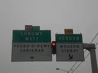 | geradeaus N381 – rechts N64 (Kreuzung in Douzy) Schild "N43" ist falsch – heutige Nummer D8043 | ||||||||||||||||||||||||||||||||||||||||||||||||||||||||||||||||||||||||||||||||||||||||||||||||||||||||||||||||