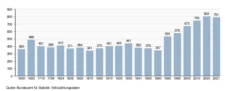 - ↑ Daten der Eidgenössischen Volkszählungen ab 1850 nach Gemeinden. (XLSX; 10 MB) Bundesamt für Statistik, Neuchâtel, 12. Juli 2024, abgerufen am 25. April 2025 (Öffnung in Excel nur über "Anhang/Excel-Datensatz" möglich).