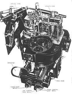 Im Gegensatz dazu berechnete das tachometrische Bombenzielgerät die Windgeschwindigkeit und -richtung automatisch. Ein motorisiertes Zielfernrohr wurde auf eine darunter angebrachte stabilisierte Glasscheibe gerichtet. Das Fernrohr war mit einer kreiselstabilisierten Plattform verbunden, die es dem Bombenschützen ermöglichte, das Ziel während des Bombenabwurfs zu beobachten. Der Bombenschütze programmierte den analogen Zielcomputer mit der Flughöhe des Flugzeugs und der Ballistikeigenschaften der Bombe. Anschließend wurden zwei elektrische Knöpfe, die mit einem Elektromotor verbunden waren, so eingestellt, dass sich das Visiergitter des Teleskops immer über dem Ziel befand, das durch den stabilisierten Glasschirm betrachtet wurde.[32]