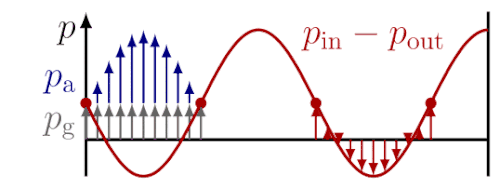 mit einer Amplitude und Kreisfrequenz . Da der zeitliche Mittelwert des Drucks an allen Stellen gleich ist, erklärt sich hieraus nicht die unterschiedliche Höhe der Flammen.