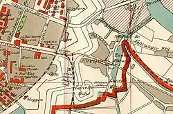 In der Zeit der Freien Stadt Danzig wurden 1925 die Straßenbahn durch die Breitenbachstraße (ulica Siennicka) geführt und der Anschluss an die Kanalisation vollzogen. Die Straßen wurden aus- oder neugebaut und der Englische Damm (ulica Angielska Grobla) verlängert. Die weitere Entwicklung begann mit dem Bau einer Schule und der katholischen Liebfrauenkirche (Kościół Matki Boskiej Bolesnej), die 1928 geweiht wurde. Im Bereich der ehemaligen Bastion Ochs wurden 1925 die Kampfbahn Niederstadt (Stadion MOSiR bzw. GKS Wybrzeże) und 1926 sowie 1929 zwei städtische Schwimmbäder für erfahrene Schwimmer und den Schwimmunterricht von Jugendlichen errichtet.[1] Die Kampfbahn wurde im Rahmen der Danziger Turn- und Sportwoche am 2. August 1925 eröffnet.[2]