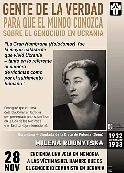 Damit die Welt es erfährt. „Die große Hungersnot (der Holodomor) war die größte Katastrophe in der Ukraine, sowohl was die Zahl der Opfer als auch das menschliche Leid betrifft.“ Milena Rudnytska hat dafür gesorgt, dass der Fall des Holodomor in der Ukraine dem Völkerbund und dem Internationalen Roten Kreuz vorgetragen wurde.