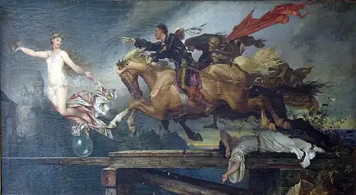Bekannt wurde er durch seine mehrfach reproduzierte Jagd nach dem Glück (1868, Nationalgalerie in Berlin), die als seine reifste Komposition angesehen wurde und für die er von der Preußischen Akademie der Künste mit einer kleinen goldenen Medaille ausgezeichnet und 1869 als Mitglied aufgenommen wurde.[7] Angeregt durch den Deutsch-Französischen Krieg und die Deutsche Reichsgründung, malte er einen Zyklus von acht patriotischen Wandgemälden für die Villa des Kommerzienrats Robert Warschauer in Charlottenburg. 1873 veranlasste ihn eine Erkrankung wieder nach Italien zu gehen, von wo er aber 1876 zurückkehren musste und kurz darauf starb. Hier schuf er eine Reihe von Reiter- und Jägerbildern mit dem Hintergrund der römischen Campagna Romana. Neben seiner Neigung zum Phantastischen und zur Romantik reizte ihn die Darstellung des Pferdes, worin er große Meisterschaft erreichte. Im Kolorit anfangs von Rubens und Tizian ausgehend, arbeitete er sich zuletzt zu einer sonnigen Klarheit und heiteren Ruhe durch. Sein Werk steht zwischen Spätromantik und Realismus.[2]