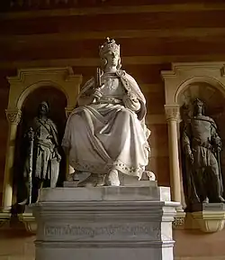 Am 1. Oktober 1273 wurde Rudolf von den in Frankfurt versammelten Kurfürsten einmütig gewählt, am 24. Oktober wurde er gemeinsam mit seiner Gemahlin vom Kölner Erzbischof Engelbert II. in Aachen zum König gekrönt.[18] Von ganz wenigen Ausnahmen durch besondere Umstände abgesehen wurde es nach Ende des Interregnums üblich, König und Königin gemeinsam in der Aachener Marienkirche, dem heutigen Dom, zu krönen.[19] Zur Legitimation ihrer Ansprüche bezogen sich mittelalterliche Dynastien gerne auf ihre Vorgänger. Anlässlich der Aachener Krönung ließ Rudolf den Namen seiner Frau Gertrud von Hohenberg in Anna und den seiner Tochter Gertrud in Agnes ändern.[20] Damit stellte Rudolf sich und sein Haus in die zähringische Tradition.[21] Anna und Agnes hießen die Schwestern und Erbinnen des letzten zähringischen Herzogs Berthold V.[22]