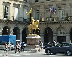 - Auf der Place des Pyramides an der Nordseite der Rue de Rivoli befindet sich eine vergoldete Reiterstatue der Nationalheiligen Jeanne d’Arc, die im Jahr 1874 von Emmanuel Frémiet geschaffen wurde. Unweit dieser Stelle wurde Jeanne d’Arc am 8. September 1429 verwundet.