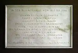 - Gedenktafel für 1944 zerstörte Büsten von Personen, die in die Walhalla aufgenommen wurden und deren Büsten daher für die Ruhmeshalle nicht restauriert oder neu gefertigt wurden