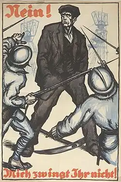 Um den Slogan: „keine Arbeit unter Bajonetten“ aufrechtzuerhalten, wurden Arbeitswillige als Streikbrecher aufgefasst und entsprechend gewerkschaftlicher Streikerfahrung auch mit Gewalt an der Arbeitsaufnahme gehindert. Der Einzelhandel wurde zu seinem Verkaufsboykott an manchen Orten durch manchmal gewaltsamen Konformitätsdruck gebracht und in ihm gehalten.[78]