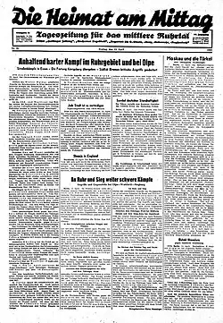 - ↑ Klaus Tenfelde, Thomas Urban (Hrsg.): Das Ruhrgebiet. Ein historisches Lesebuch. Klartext, Essen 2010, ISBN 978-3-8375-0286-2, S. 712 f. (Originaltitel: An die Bevölkerung der Kreise Duisburg, Oberhausen, Dinslaken und Rees! 1945. Text abgedruckt in: Stadtarchiv Duisburg (HG.) Duisburg im Nationalsozialismus. Eine Dokumentation zur Ausstellung des Stadtarchiv Duisburg. Duisburg 1983, S. 137).