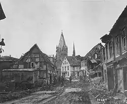 Die strategischen Luftstreitkräfte setzten bis Ende März 1945 ihre Bombenangriffe auf das rheinisch-westfälische Industriegebiet und das Umland ohne Unterbrechung fort. Dabei wurden die Städte Essen, Hagen, Witten und Dortmund durch britische Flächenangriffe völlig zerstört. Der letzte Angriff auf Dortmund am 12. März 1945 war der schwerste konventionelle Luftangriff, der im gesamten Verlauf des Zweiten Weltkriegs jemals gegen eine Stadt in Europa durchgeführt wurde.[6] Dortmund war eine der am stärksten zerstörten Städte Deutschlands.