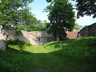 | Erhaltungszustand | Umfassungsmauern, Turmrest, Graben und Wall | |