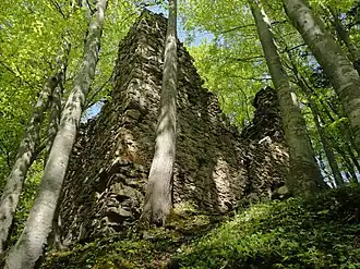 Die Reste der Höhenburg bestehen aus einem rechteckigen Wohnturm mit weiteren Mauerresten, dendrologisch auf 1285 bis 1293 datiert. Untersuchungen von 2010/2011 ergaben, dass der Wohnturm in einem Zug erbaut wurde. Aus den Resten kann nur geschlossen werden, dass neben dem Erdgeschoss zwei bis drei weitere Geschosse existierten. Das Sockelgeschoss diente wohl als Keller und weist noch fünf Schlitzfenster auf, ähnlich Schießscharten. Die negative Balkenlage des darüber befindlichen Geschosses ist in der Burgruine noch sichtbar. Ein Treppenschaft für den Aufgang konnte nachgewiesen werden. Auf der Ostseite befindet sich noch der Hocheingang. Reste der Fenster zeigen einen gemauerten runden Fensterabschluss in Bogenform sowie Fensterbänke zum Inneren.[1]